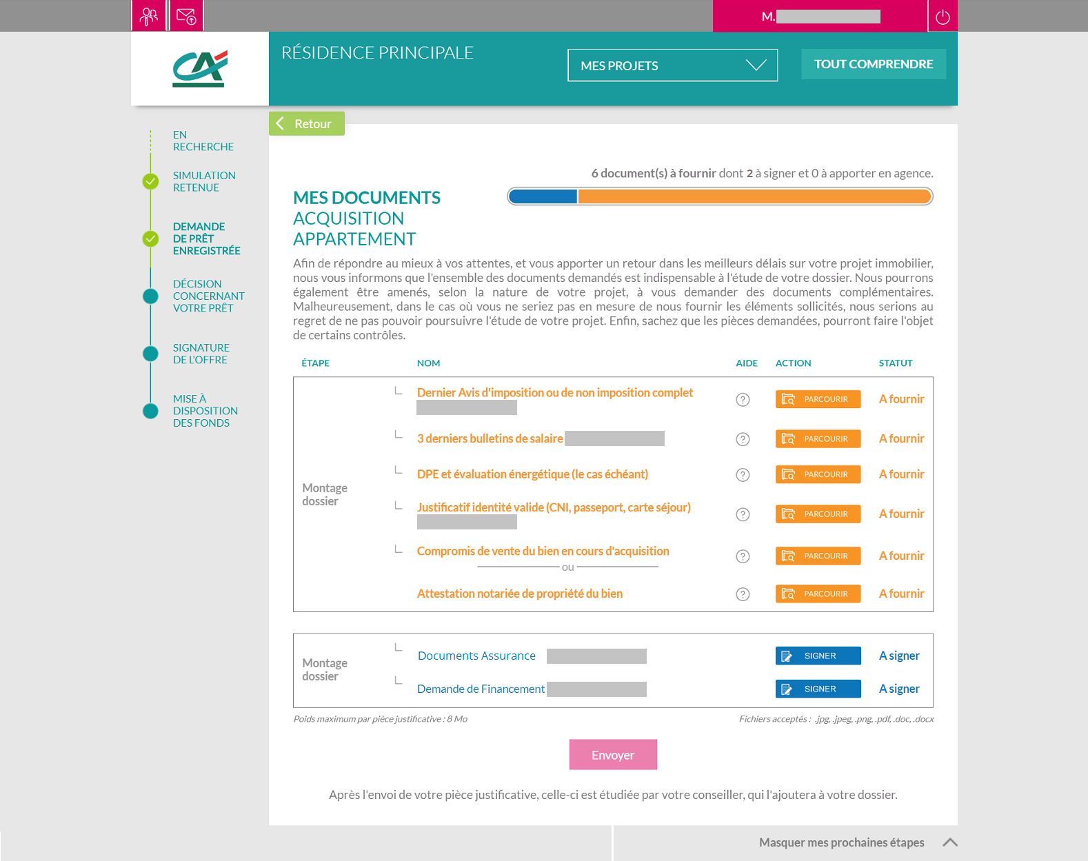 Sur cette page s'affiche l'ensemble des documents à transmettre à votre conseiller pour l'étude de votre dossier. Pour signer votre demande de financement ou vos documents Assurance, cliquez sur le bouton "Signer" dans la rubrique "Montage dossier" en bas de la page