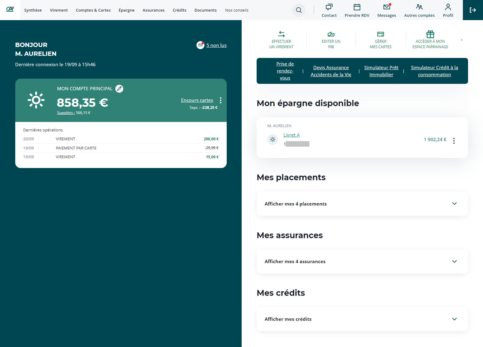 Connectez vous à votre espace Crédit Agricole et cliquez sur "Assurances" en haut de la page