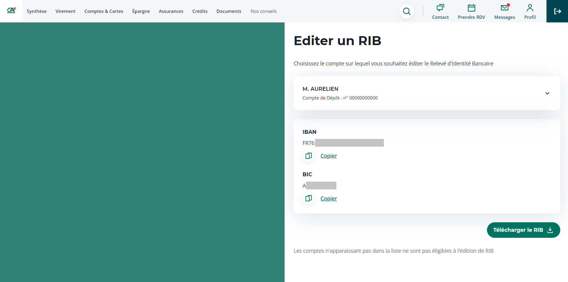 Cliquez sur "Télécharger le RIB" ou sur "Copier" pour mémoriser les informations de votre RIB