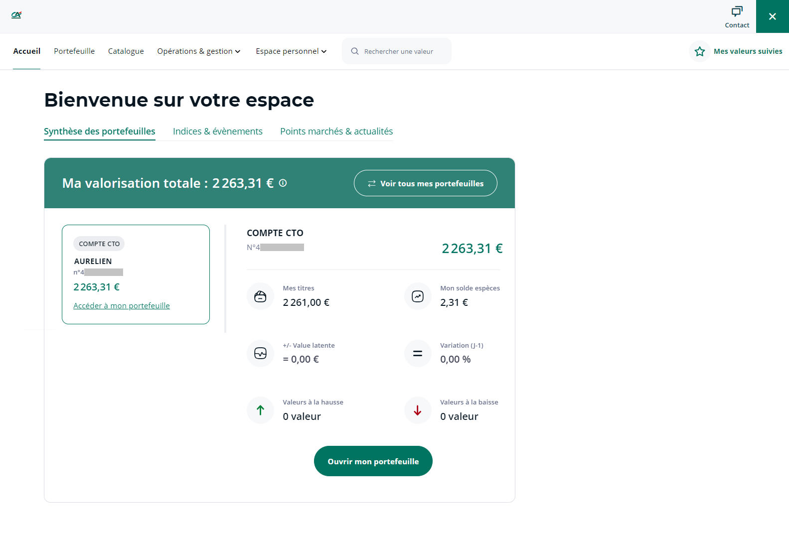 La page d’accueil du service CA Bourse en ligne s'affiche. Cliquez sur "Portefeuille" en haut de la page