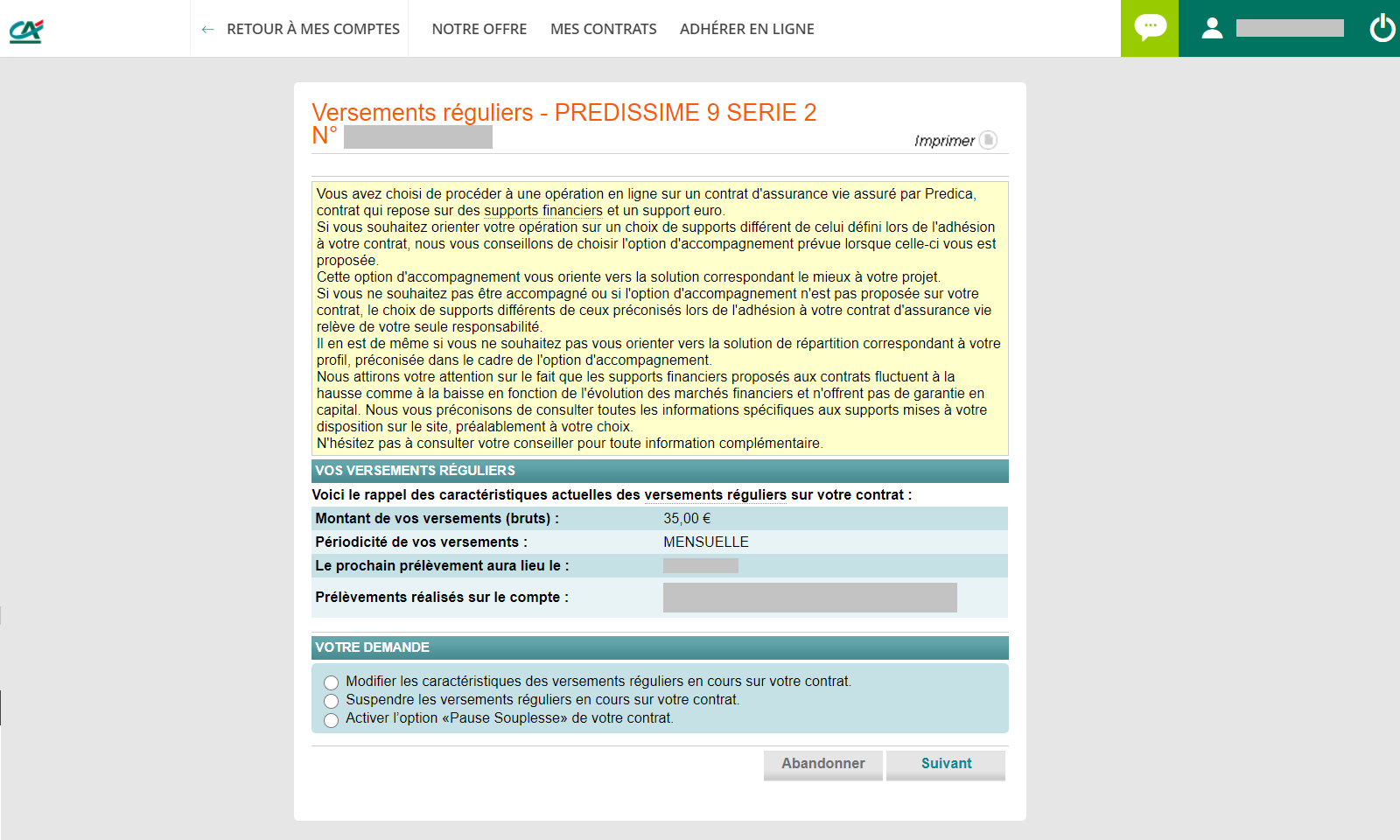 Sélectionnez la ligne "Modifier les caractéristiques des versements réguliers..." et cliquez sur "Suivant" en bas de la page
