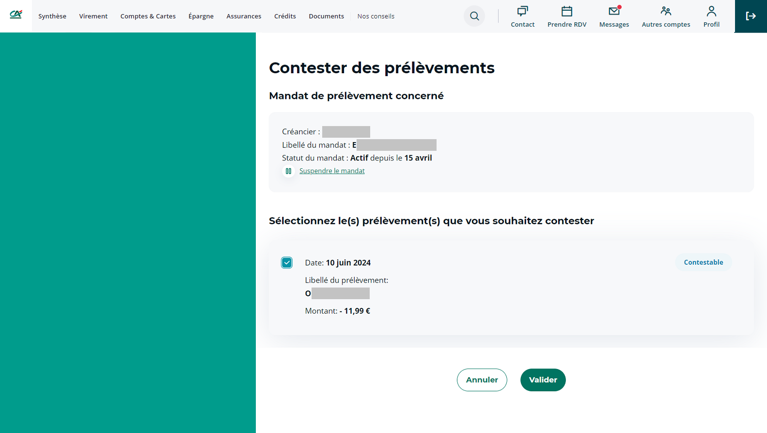 Sélectionnez l'opération à contester, cliquez sur "Valider" et suivez les étapes pour finaliser votre demande