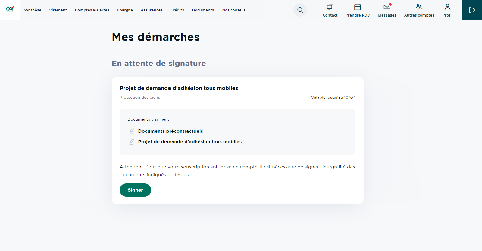 Sur cette page, vous retrouvez les documents en attente de signature. Cliquez sur "Signer" et suivez les étapes pour finaliser votre signature