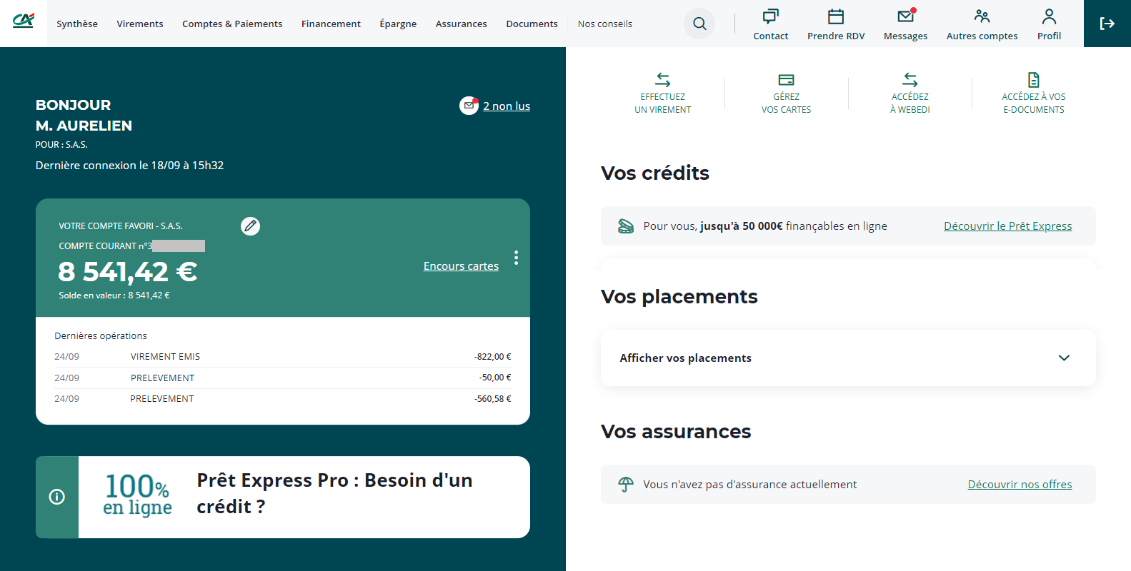 Connectez vous à votre espace Crédit Agricole Professionnel et cliquez sur le bouton "Documents" en haut de la page